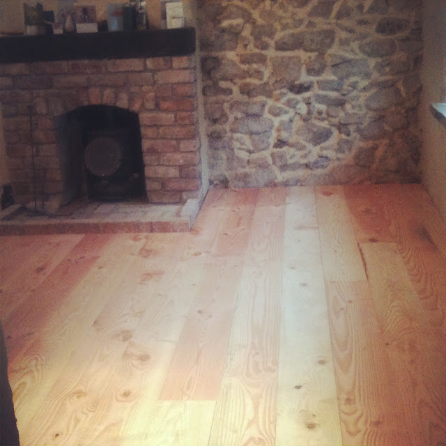 Today was a real milestone, as we went off to collect the freshly milled Douglas Fir floor from Ballytrim Sawmills. All our timber has come from Clarke Cunningham, and we were happily surprised to find that he’d done half as much again as we’d asked for, which is brilliant and will make an awful lot of shelves around the place. We spent the afternoon laying the floor, and in a few months will sand and oil it once it has settled in. Until then we’ll enjoy walking on the new surface, and marvel in the fact that we have another room to use.