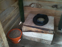 From the back (downhill) side you can see the composting chamber below, which is surrounded by two layers of chicken wire stuffed with straw.Â