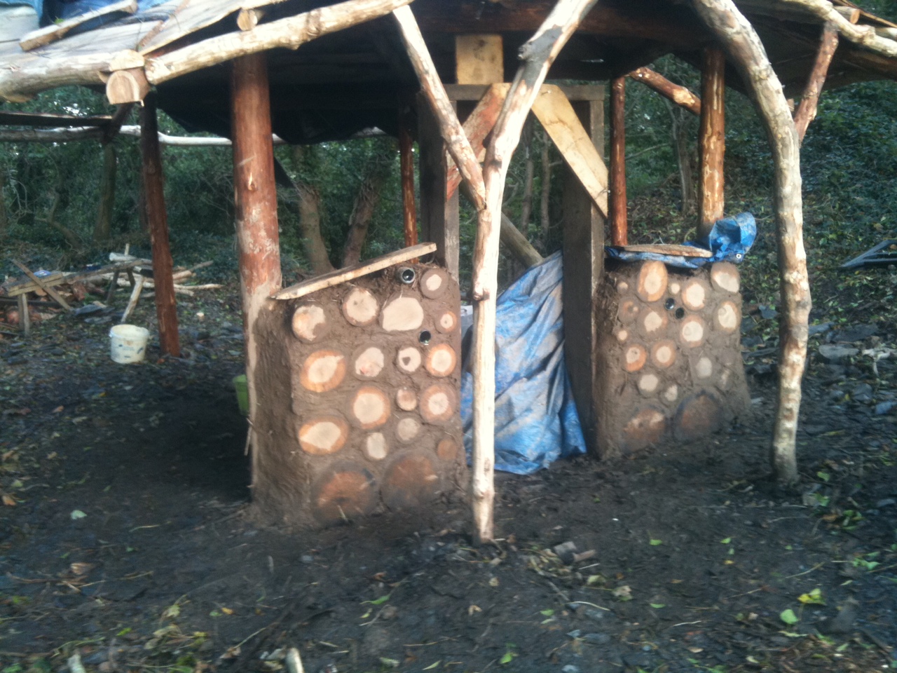 Another extraordinarily wet volunteer day on Monday, but undaunted, the team made a start on the cob and cordwood wall at the front of the roundhouse. In the morning we learned how to cut wine bottles in half, using a glass cutter and hot and cold water, and then after lunch everyone got stuck in to the messy business of making cob and getting the wall started.