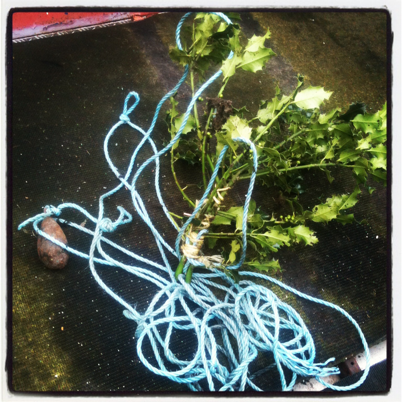 Tie a weight to the end of a length of rope, tie a good lot of holly (very securely – you don’t want to end up with a chimney full of holly), onto the rope – give yourself enough rope that it will appear in the fire place below.