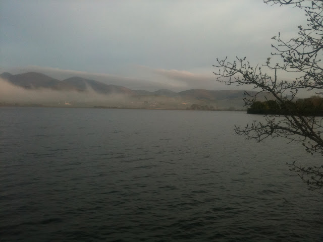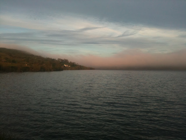 Without doubt the best time of the day, and here is dawn breaking over the lake at the end of the road. The mist has just rolled down from the mountains, and you can imagine that almost anything could lie beyond it.