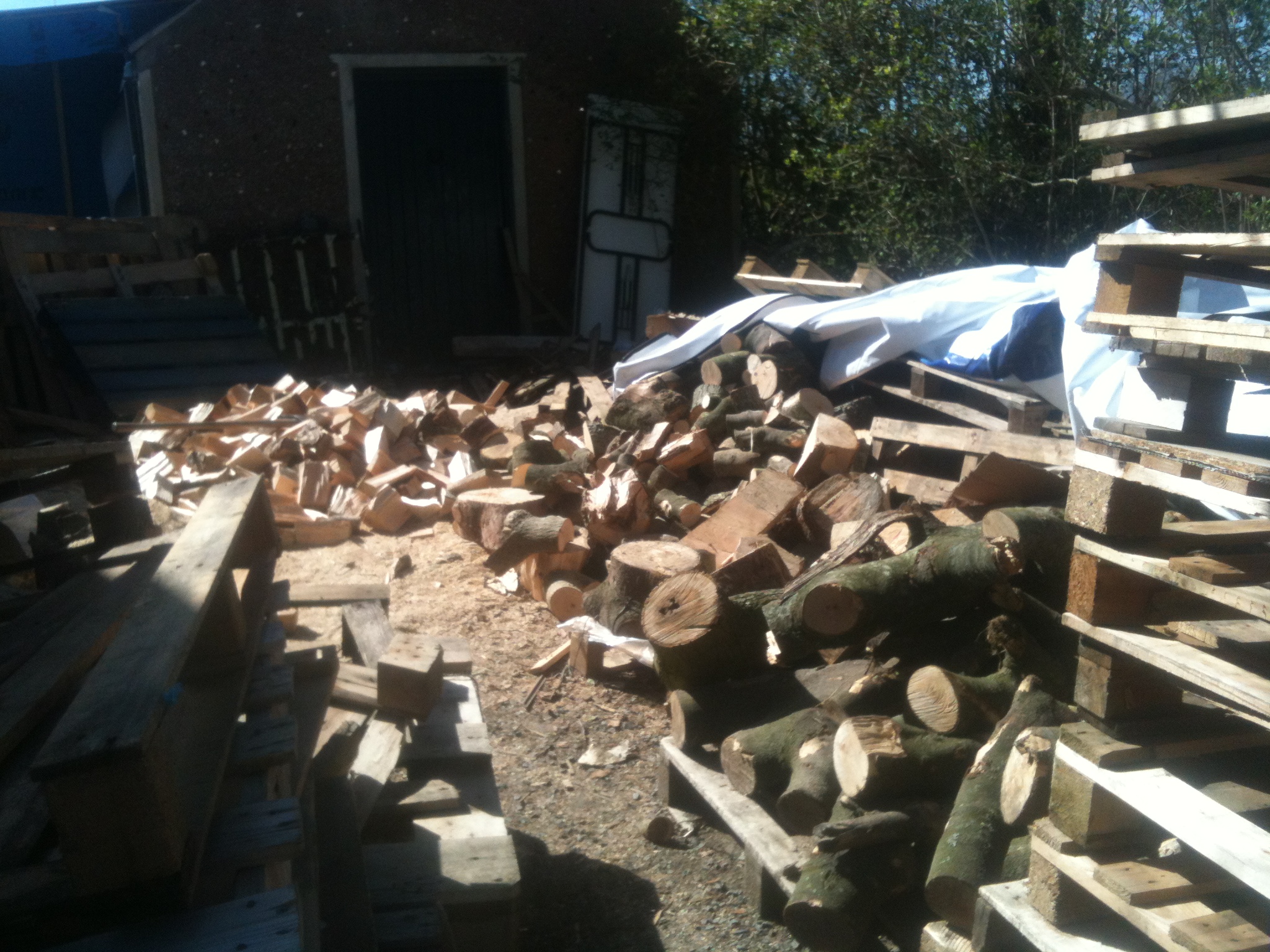 Several tonnes of gifted ash and sycamore later, combined with 60+ pallets, several tonnes of a fallen fir tree, a tonne of larch, and most recently another 5 or 6 tonnes of what might be larch, and we have gone from feast to famine. Our shelter can hold 24 cubic metres of split wood, and it is now over half full –