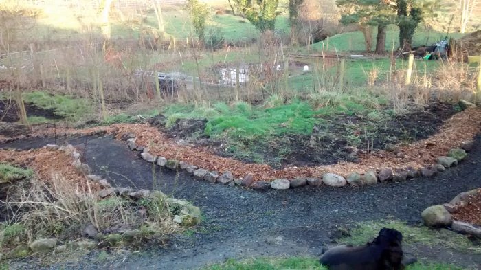 We’re also diligently covering any gaps in the sheeting around the main willow plantation for the same reason. The basket willow that got a good start is at least twice the size of the stuff that was overcome by grass, which despite the low temperatures seems to be growing already. The challenge this winter is to double the amount of planted willow that we have, and then once the fences are established, to crop the tops of them. Something along the lines of this marvellous willow hedge at Felin Uchaf in North Wales..