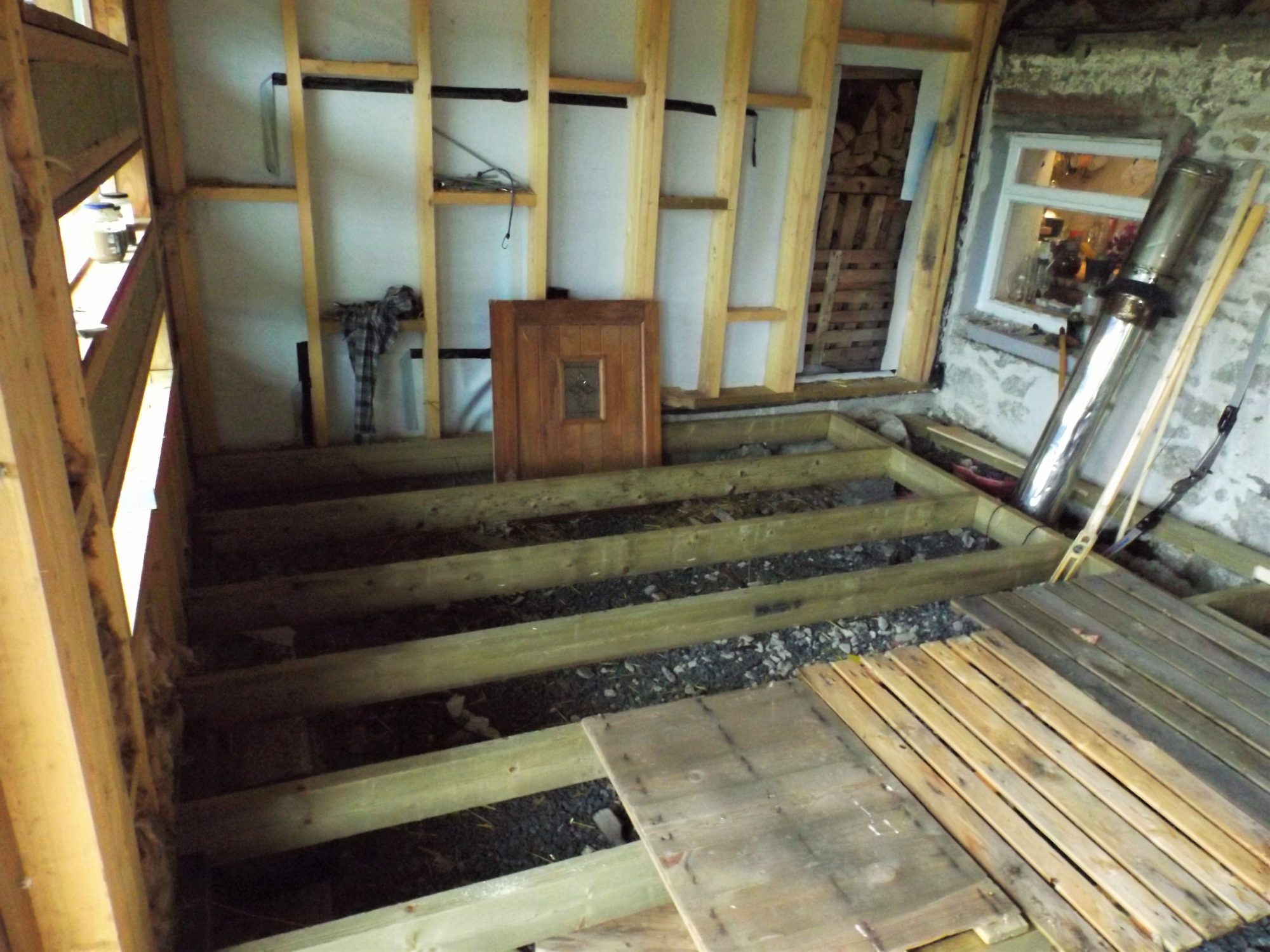 Usually I post about the things that have gone right, but we are on a learning curve, and things often don’t work out first time around. The floor in the new build is one such case. After much deliberating, and mainly due to budget constraints, I put in a suspended floor, with a membrane to hold insulation between the joists, and to keep draughts out. The space beneath the floor has to be ventilated in order to keep the air moving, otherwise still, cold air will encourage rot in the joists.