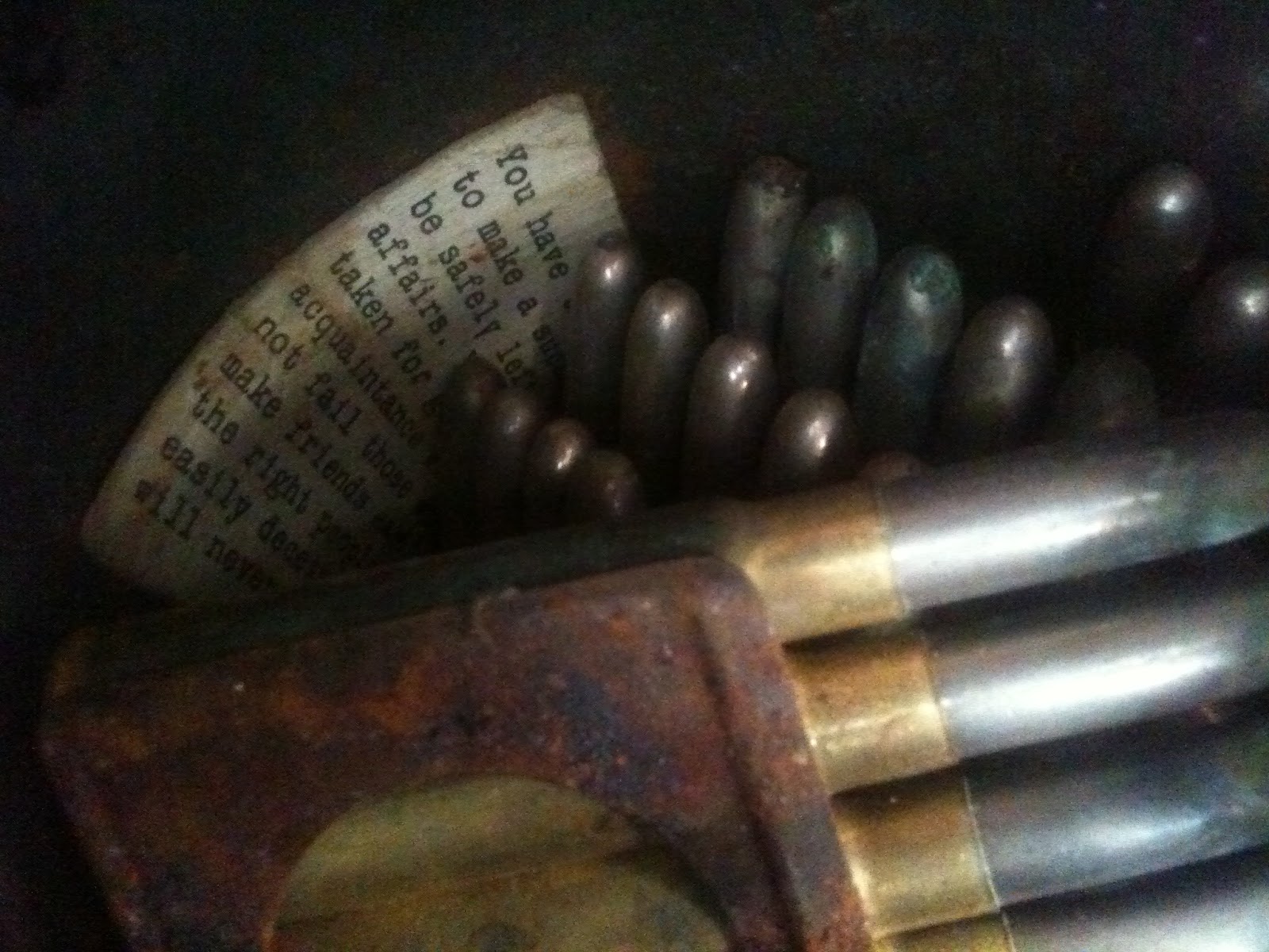 In my quest to find the missing bits of the cooker, I decided to go through the many tins and boxes of old scrap out in the shed. Finding an old dried milk tin, I gave it a good shake (as you do), and decided it must be full of nuts and bolts. Imagine my surprise when I opened it to find clips of rifle bullets..