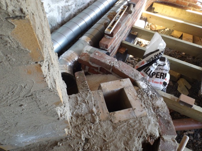 The ducting is all properly jointed and sealed now, and here you can see the burner built up as far as the top of the fuel feed (right) and the bottom of the riser (left). Building with firebrick and very smooth clay mortar means the joints are very small – down near 1/16″ to keep as much heat in as possible and the fire super efficient.