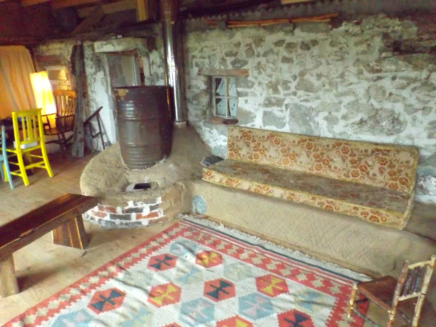 Anyhow, above you can see the outer brick surround of our heater – the bricks were unwanted surplus, and we’ve used lime mortar to build with. This wall contains the flue, which will be encased in a large amount of cob, and the brick will be clay plastered too. The burner will live at the near end. We’re building it before the floor goes in to make life easier.