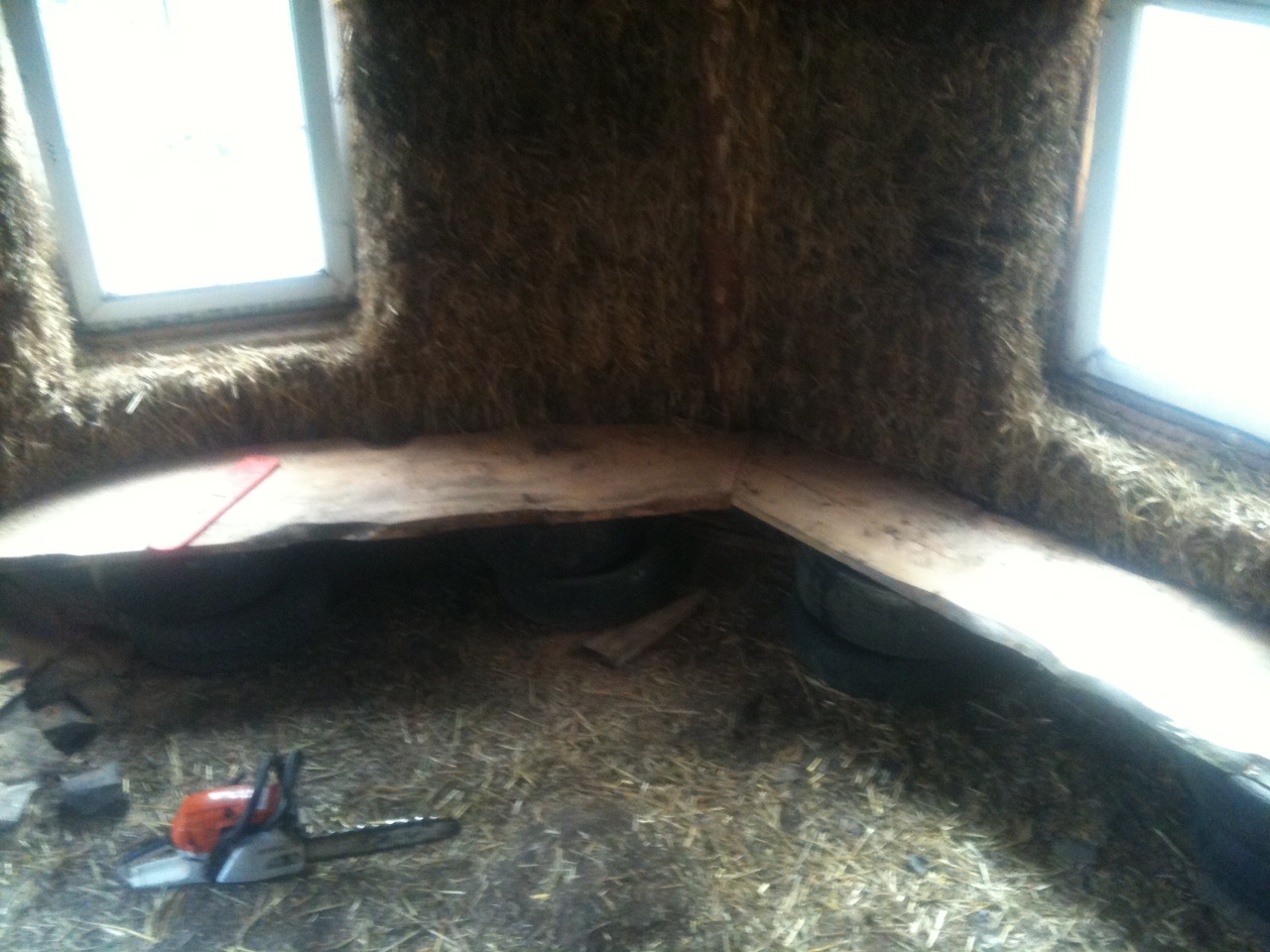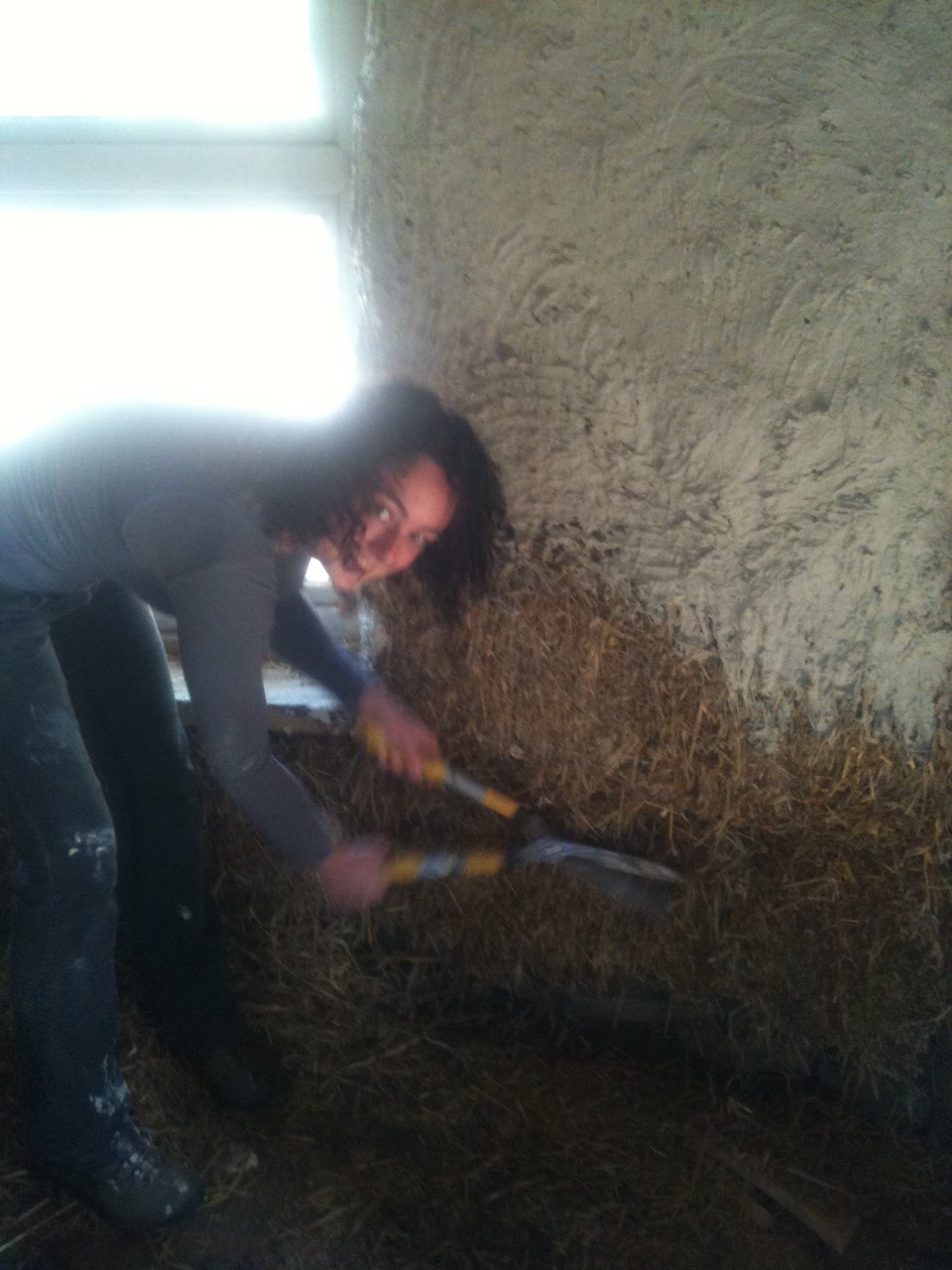 | Helen trimming the straw walls |