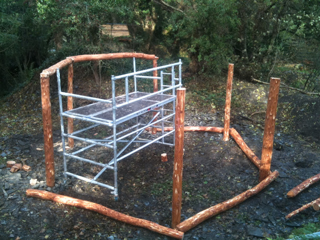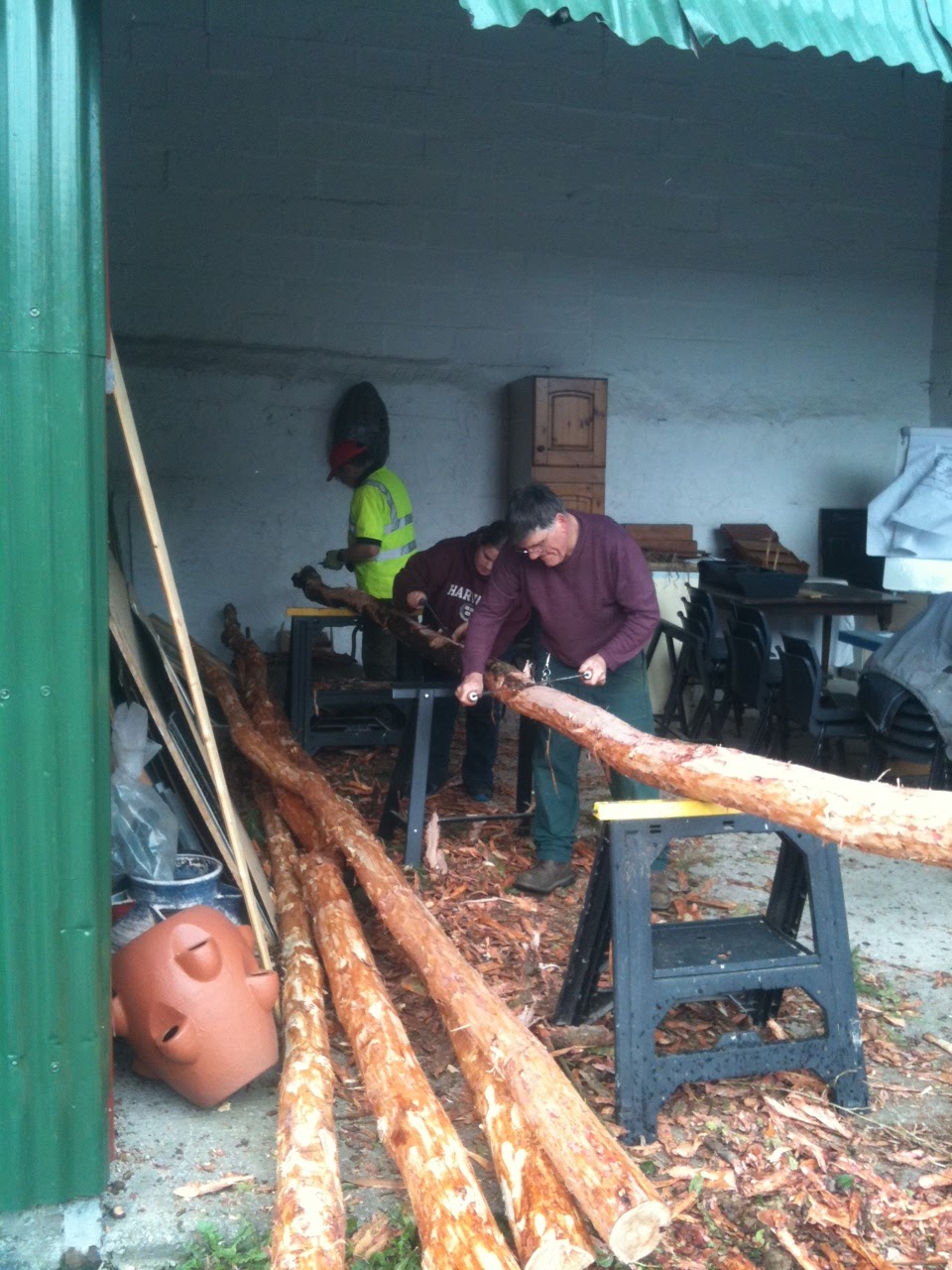 While we were doing the posts, the rest of the team worked away de-barking all the remaining timber ready for use. By the looks of it we will have just enough to create the basic frame.