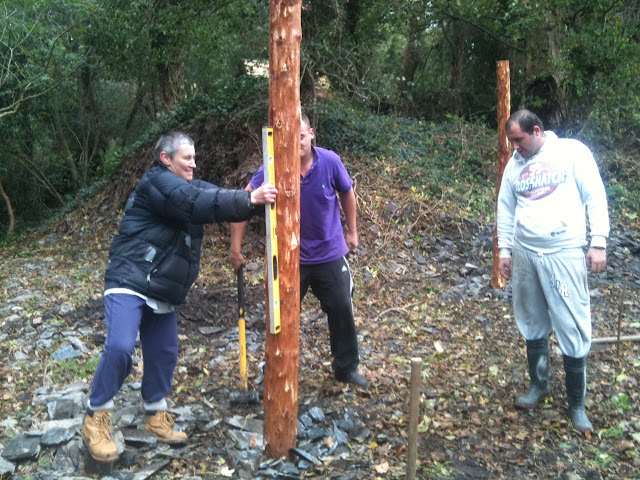 Day three on our roundhouse build, and we have made excellent progress. Today we prepared the supporting posts by charring the ends of them in a fire, before dropping them into the post holes dug on Monday. Clinton, Chris and I backfilled the holes with slate, pounding it in with sledgehamers to secure the posts really well. Here is Tina checking one for uprightness.