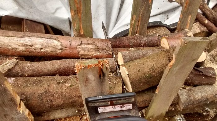 We process a lot of firewood here and these two simple additions have made life a million times easier. First, we made up a thing to put long bits of wood in for cutting. Its a heavy bottom piece with uprights made from easily replaceable pallet wood, spaced so that cutting midway between them leaves us with 10″ pieces. Simply fill it up with wood, and you can cut mountains of fiddly bits with just 3 or 4 cuts.