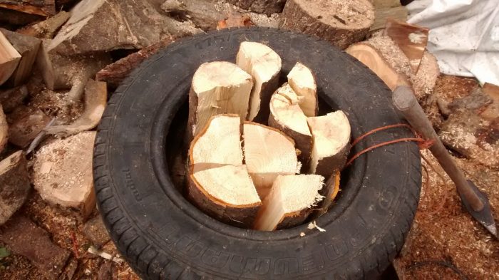 The next thing is the simplest – take a tyre, put your log (or logs, if they are small) in, and batter away with an axe or a splitting maul, (which I use). Three or four blows and your split logs are ready for the pile. No more running around picking up the bits once split. I have a tyre that fits on top of my splitting block and it stays in place without any extra attachment.