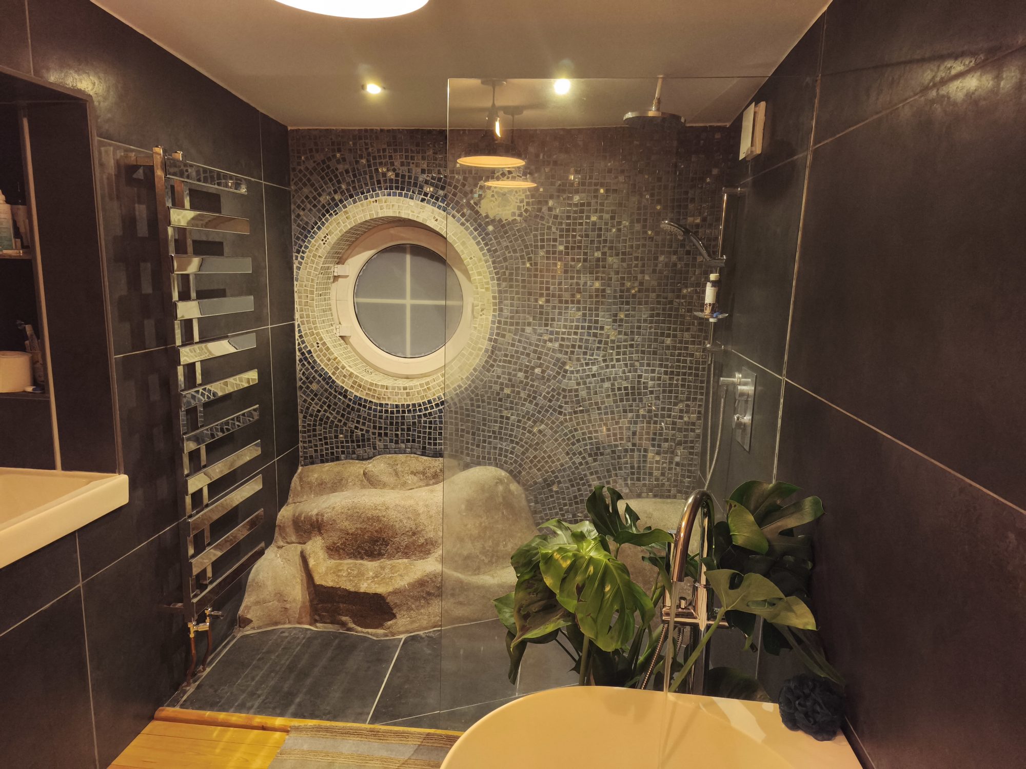 John did an amazing job of building a cavity wall over and through a huge lump of granite, and even tolerated my request for round windows, which I hope you will agree are suitably hobbity. We were able to extend the green roof over this room, and by the summer of 2025 I was getting stuck into the interior. Because it was all inspired by places I’d seen on my travels, I didn’t want just a plain old bathroom, so Claire and Lyra came up with a great mosaic wall for the shower, which we all helped design and make.