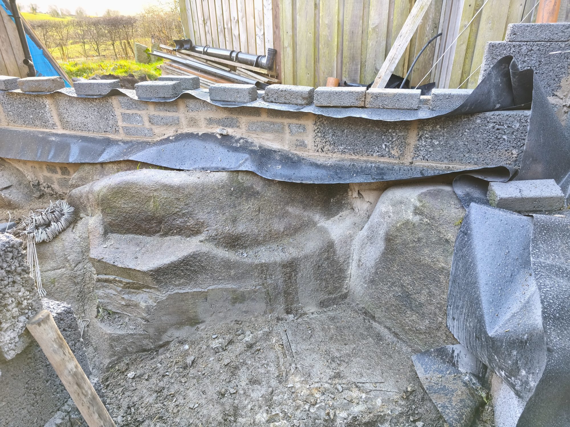 This seemed like a great idea so we got on with clearing the woodstore, rat and all, to make it ready for the blockwork replacement. Now part of the reason we didn’t do this originally is that the house is built directly onto granite, and at that corner of the house the granite erupts from the ground into a great lump. A very hard to shift lump. In fact it’s not actually granite, its a close relative called granodorite, which was pushed up as molten rock some 300 million years ago, and been there ever since. It started to form when this land was south of the equator, if you can believe it, and so has had quite the journey until I came along.