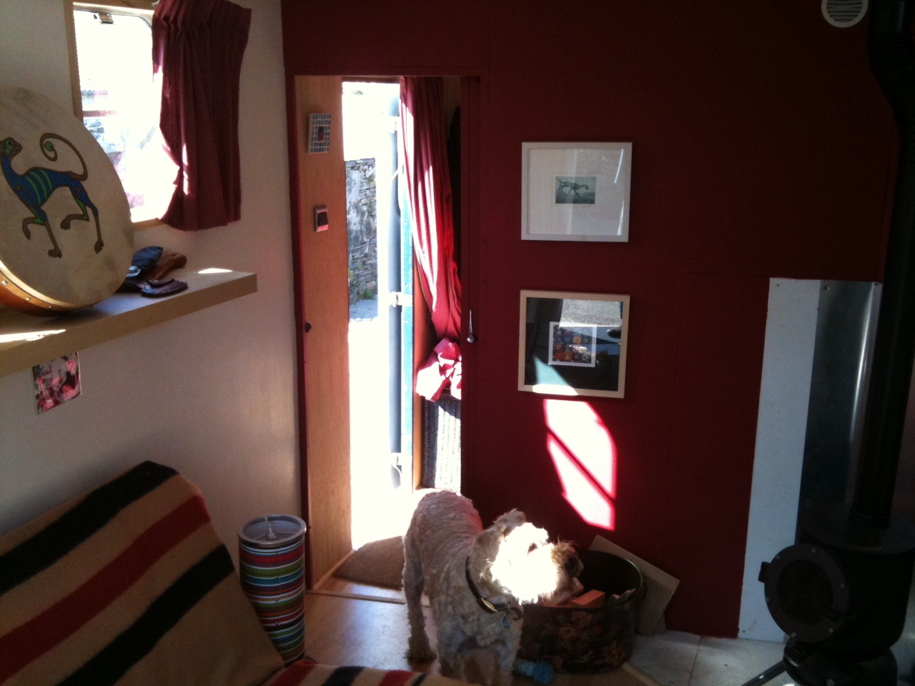 We offer interesting accommodation in our converted horsebox, which features a big kitchen/diner, hot and cold running water, gas hob, fridge, lots of storage, shower/loo/washbasin, choice of sleeping (over cab or in the back), and woodburning stove. All electricity is solar powered. It is warm and cosy and two people can live in comfort (we did for over a year).