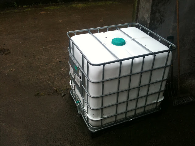 Behold, the heart of my new rainwater harvesting system. This 1000 litre food grade container cost just £30, and will hold enough water to supply the truck for about a fortnight. Thus I’ll be using less than a quarter of the average person’s water consumption. Where is the water coming from? The barn that I’m parked in front of – given our recent rainfall, the gigantic silage barn roof will fill this in no time at all.