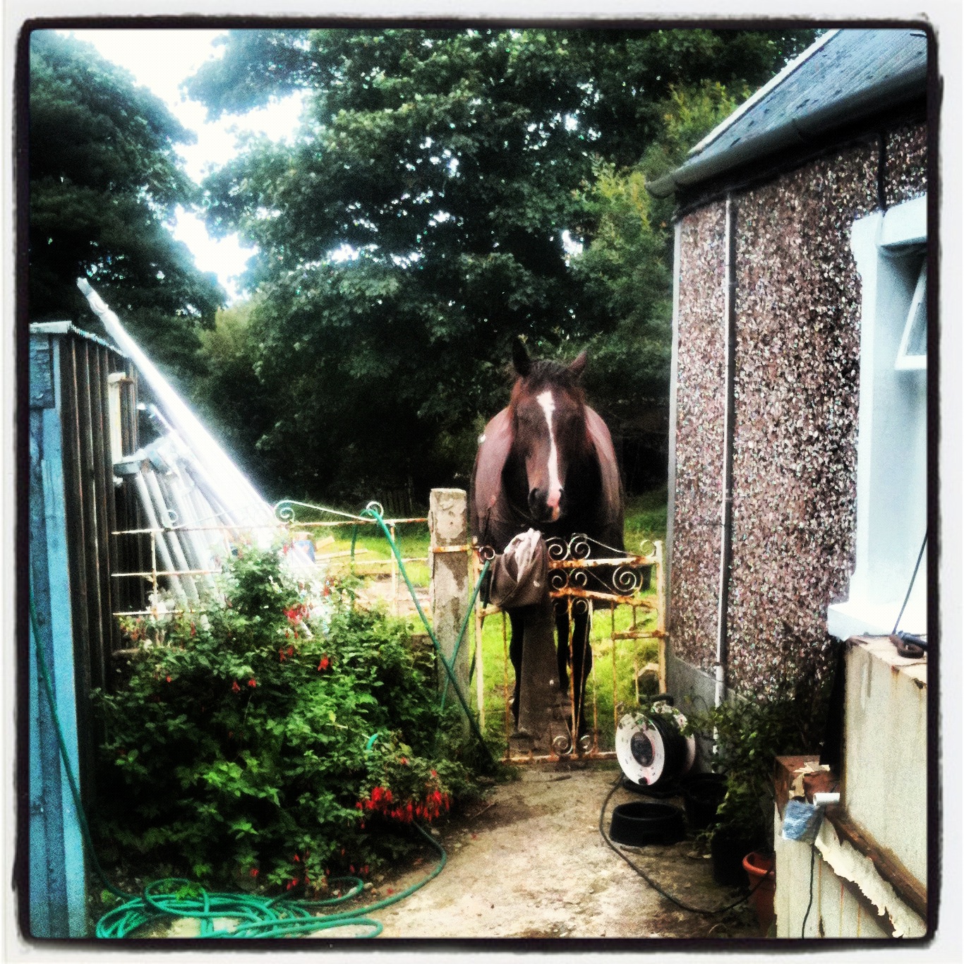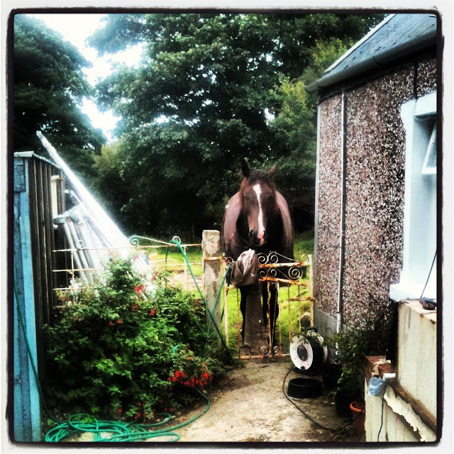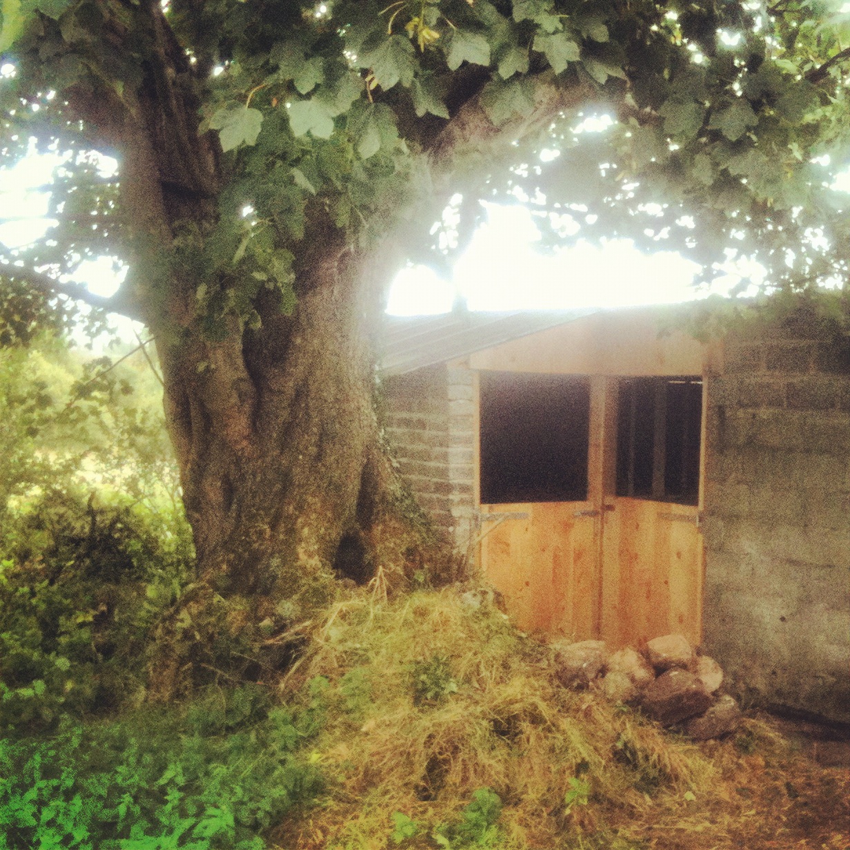 Ever since the horses arrived here, and through all the terrible weather, the lack of stables has really bothered me, and Sherafey, who dashed into hers as soon as it was finished. It also means poor Mel here can eat his dinner in peace without being monstered by the tiny tornado. The stables were old pig sheds, and with a bit of rebuilding, and the creative use of the old roof from the house extension, are just the job, being below the huge beech tree beside the house –